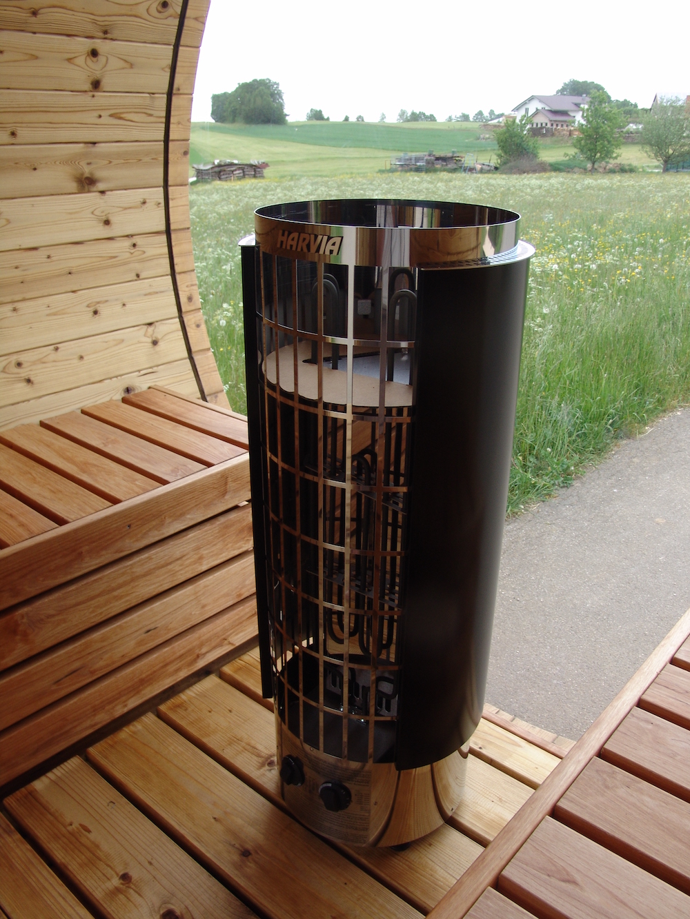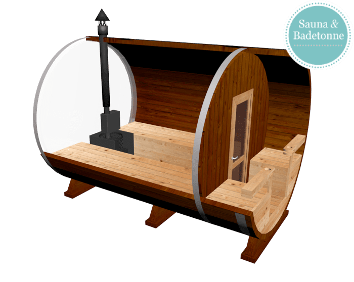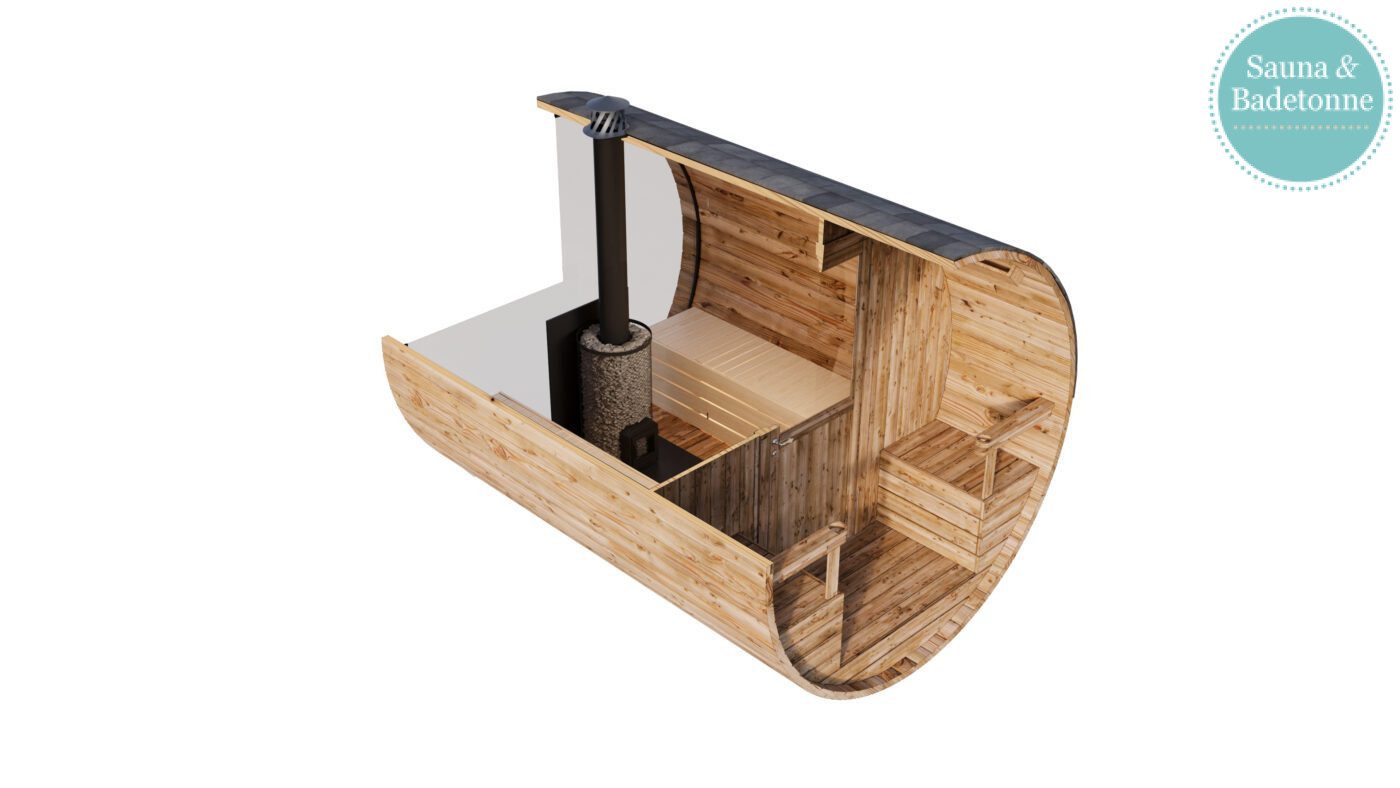 - Tonnensauna (Durchmesser ca. 205 cm; Höhe ca. 220 cm; Länge 274 cm inkl. Terrasse)