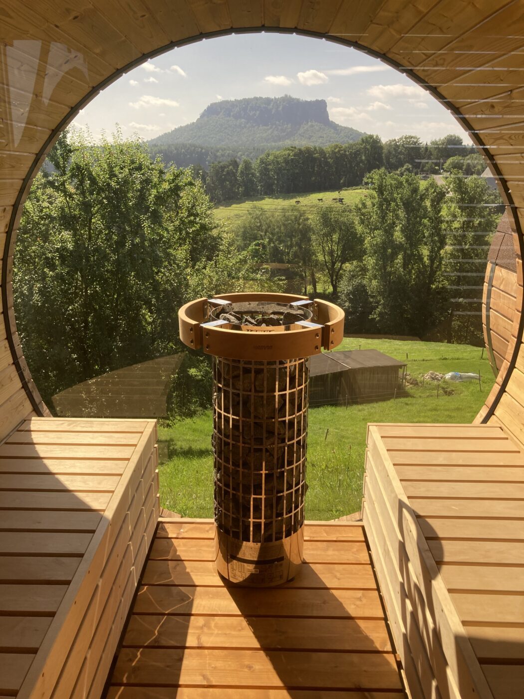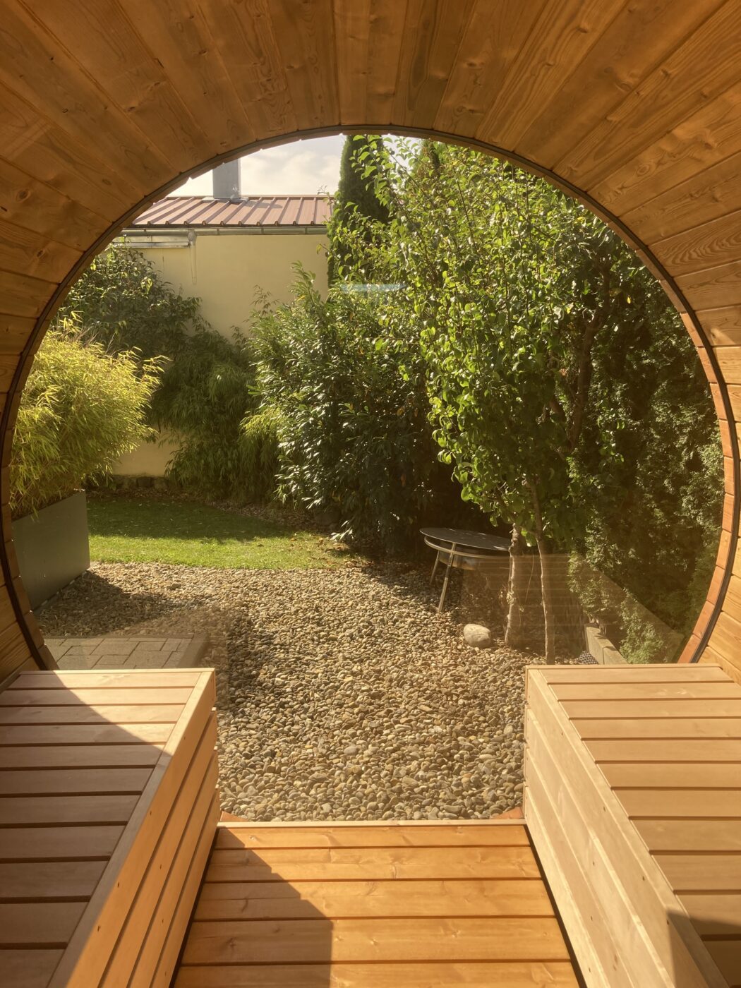 Tonnensauna mit Glaswand in Tessin